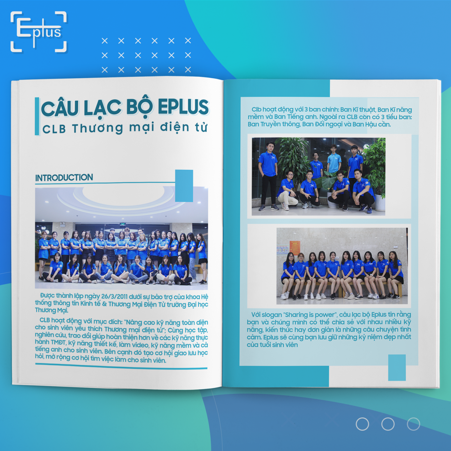 Với phương châm hoạt động #Eplus_Sharing_is_power xuyên suốt 10 thế hệ thành viên, Eplus đã, đang và sẽ nỗ lực, phấn đấu nhiều hơn nữa để ngày 1 lớn mạnh, là điểm đến cho các thế hệ sinh viên trường Đại học Thương Mại yêu thích TMĐT.