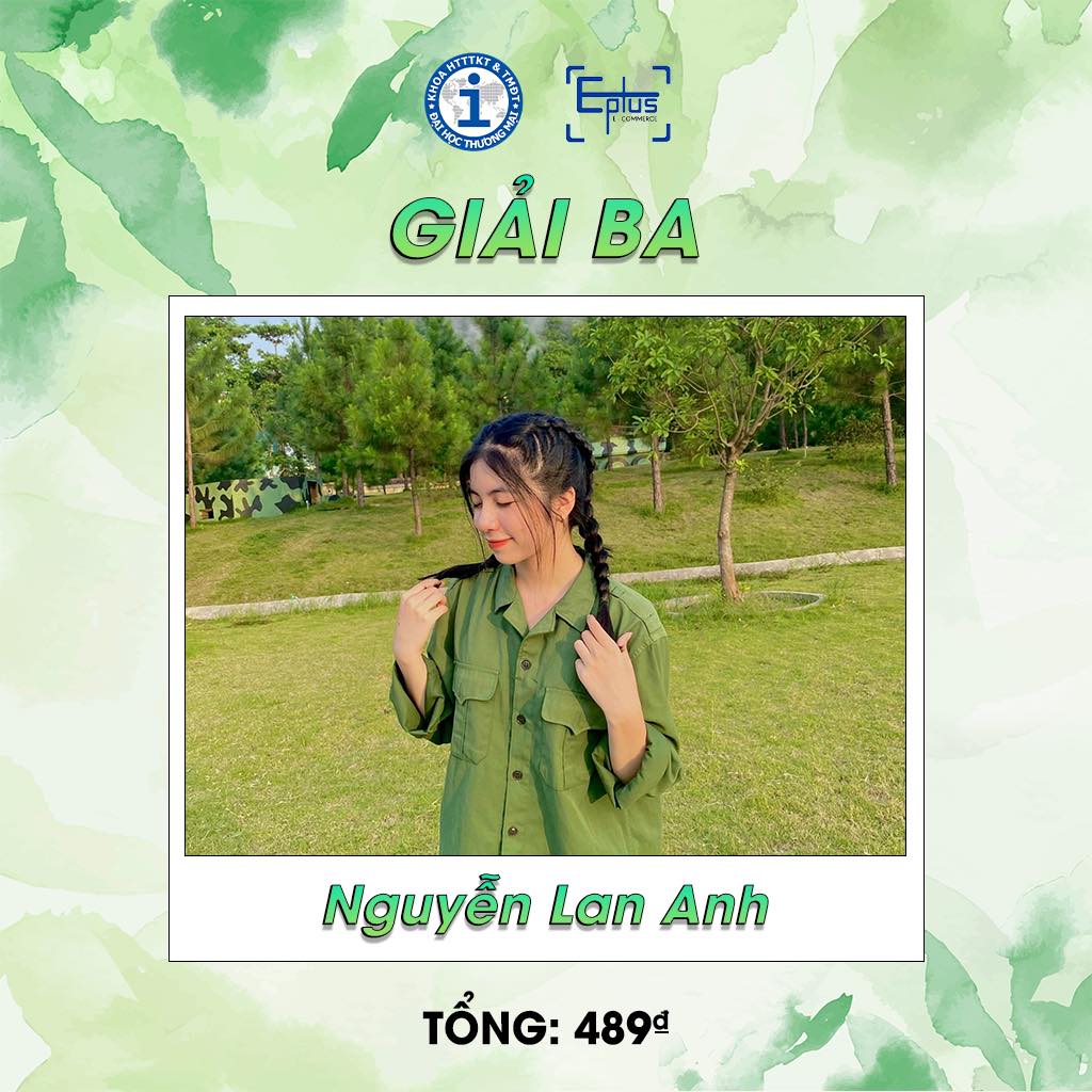HAI GIẢI BA xin chúc mừng bạn Nguyễn Lan Anh lớp K57S2 - Trung đội 9. Tổng điểm 489₫