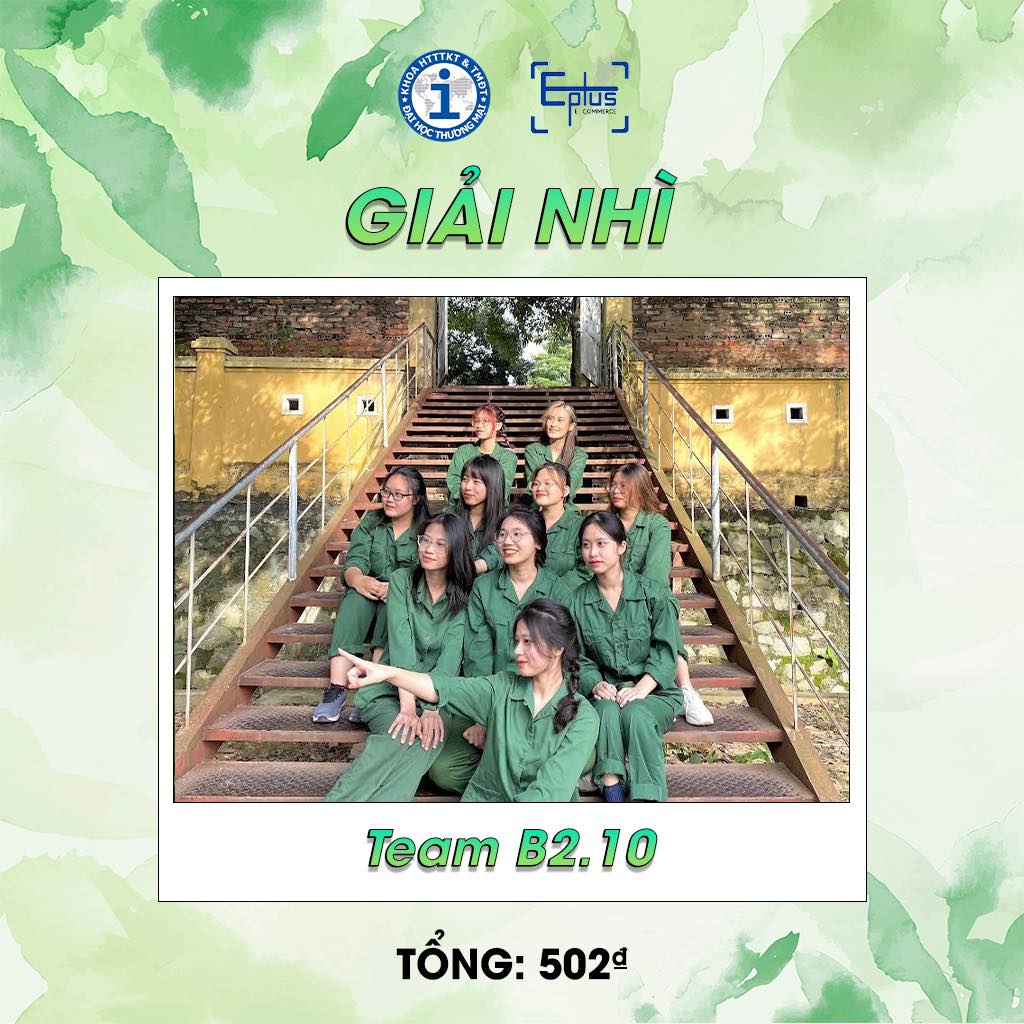 GIẢI NHÌ thuộc về team B2.10, lớp hành chính K57HC1 + HC2 - Trung đội 6 và 7 với số điểm 502₫.