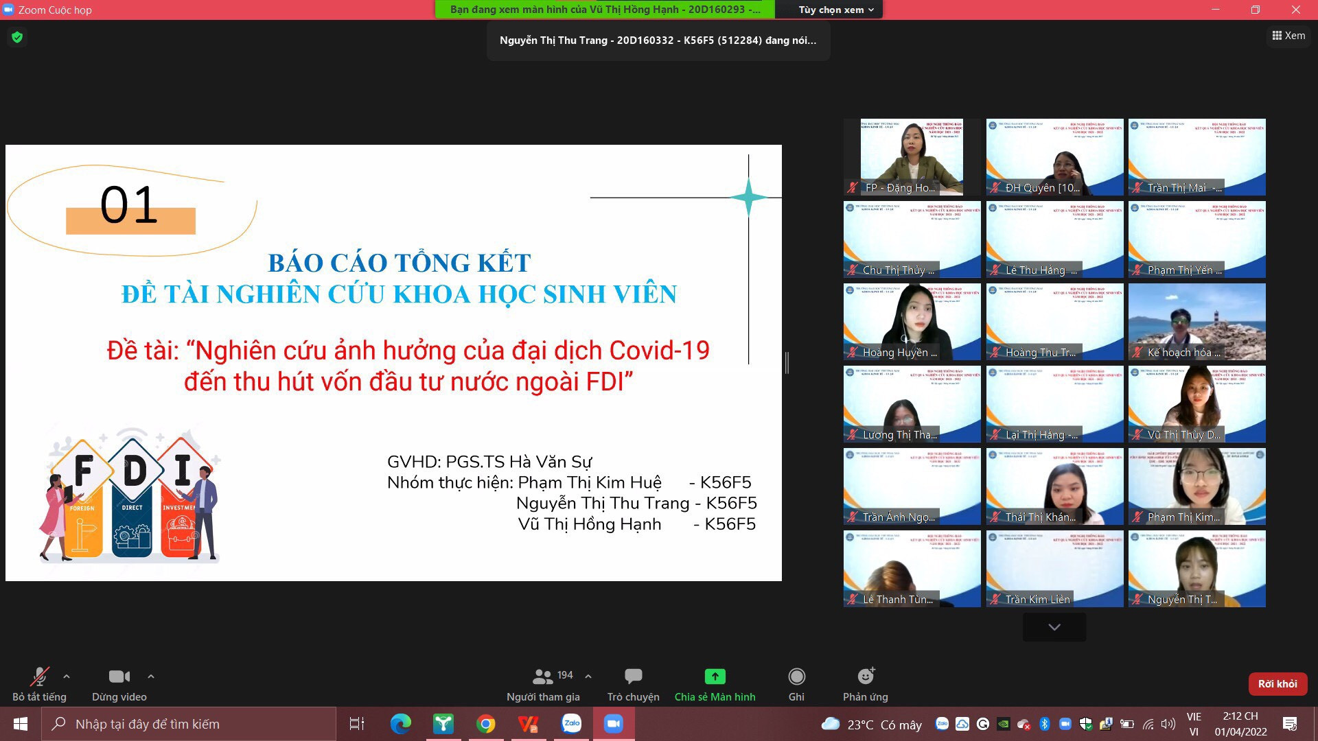 ✅ 01 giải nhất: Đề tài "Nghiên cứu ảnh hưởng của đại dịch COVID-19 đến thu hút vốn đầu tư nước ngoài" do bạn Phạm Thị Kim Huệ, Nguyễn Thị Thu Trang, Vũ Thị Hồng Hạnh K56F5 thực hiện dưới sự hướng dẫn của PGS.TS. Hà Văn Sự