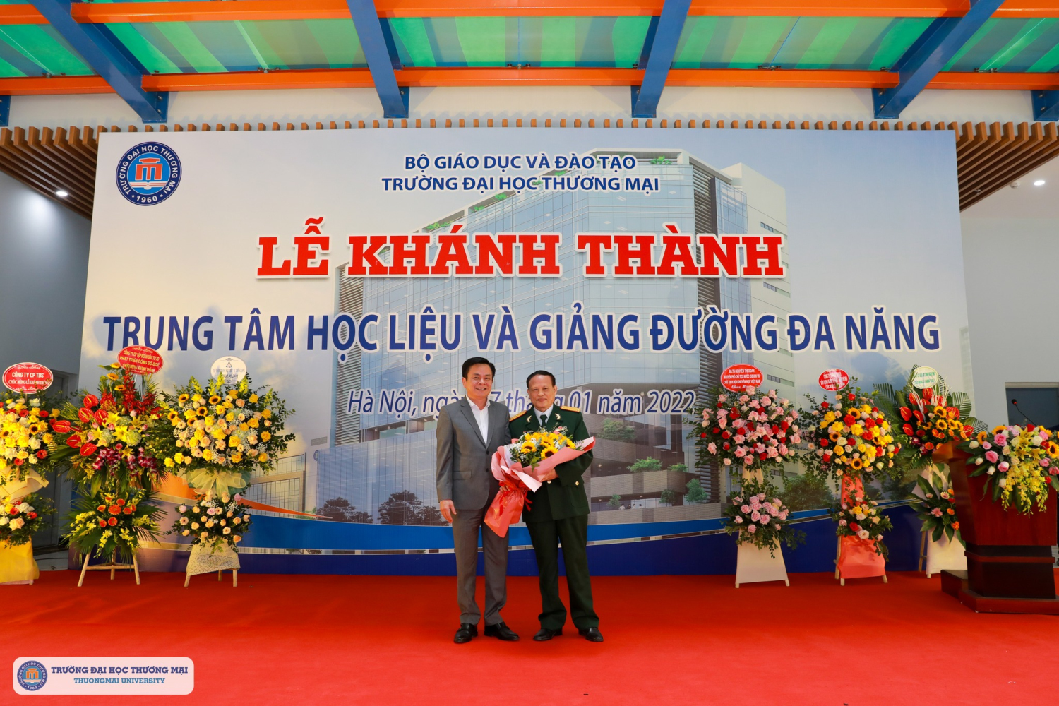 9h00 ngày 07/1/2022 tại sân tầng 1 nhà P, Trường Đại học Thương mại đã diễn ra Lễ cắt băng băng khánh thành Trung tâm học liệu và Giảng đường đa năng.