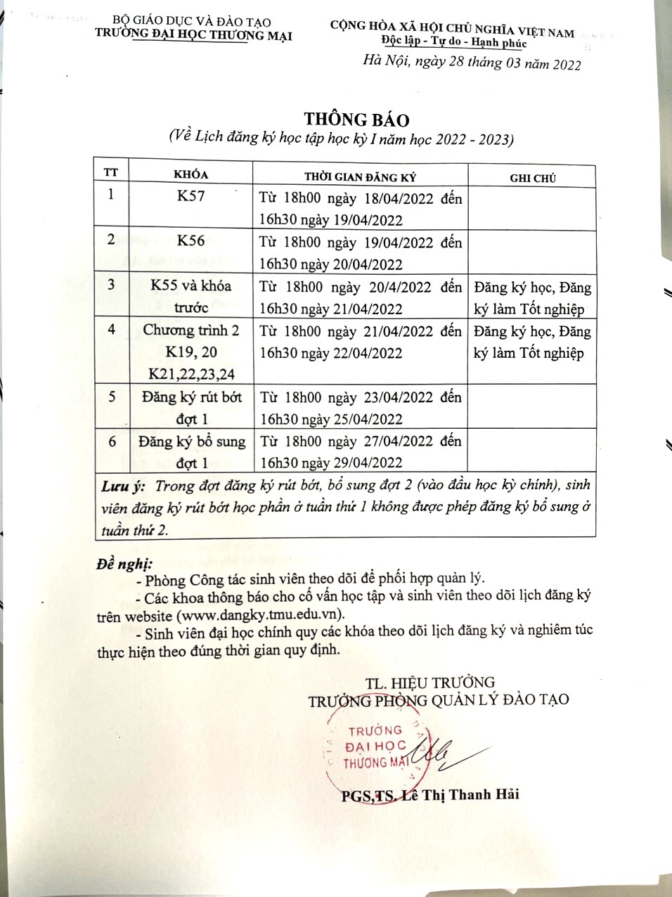 Thông báo lịch đăng ký học tập học kì I năm học 2022-2023.