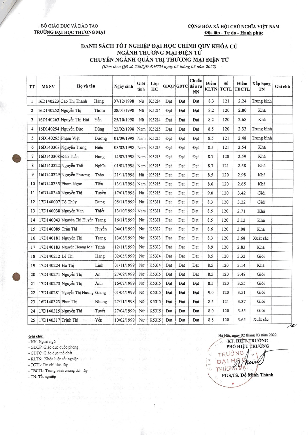 Quyết định 258/QĐ-ĐHTM của Đại học Thương mại ngày 02 tháng 03 năm 2022 về việc công nhận tốt nghiệp đại học chính quy cho 98 sinh viên chuyên ngành Quản trị Thương mại điện tử khóa 54 và Khóa cũ.