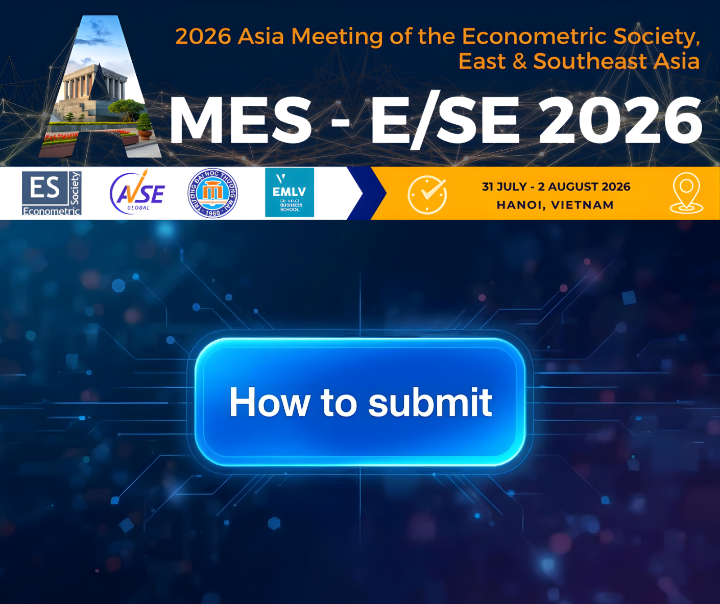 Hội nghị AMES 2026 sẽ diễn ra từ ngày 31/07 đến 02/08/2026 tại Hà Nội. Đây là sự kiện quy tụ các học giả và nhà nghiên cứu hàng đầu để thảo luận về những công trình tiên phong trong lĩnh vực Kinh tế lượng, Kinh tế học, Tài chính quốc tế và các lĩnh vực liên quan.