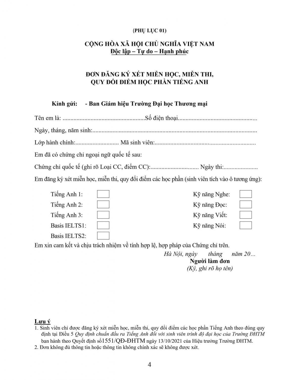 Thời gian xét: tuần đầu mỗi học kỳ Đối tượng áp dụng: Sinh viên trình độ đại học từ khóa tuyển sinh năm 2021 Phương thức: Sinh viên K57 có nhu cầu xét miễn học, miễn thi, quy đổi điểm Tiếng Anh và miễn học học phần Tin học quản lý trong học kì I 2021-2022 nộp hồ sơ theo đúng quy định về Phòng Quản lý đào tạo vào tháng 11/2021.