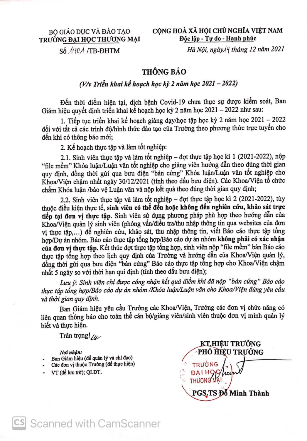 THÔNG BÁO V/v TRIỂN KHAI KẾ HOẠCH HỌC KÌ 2 NĂM HỌC 2021-2022