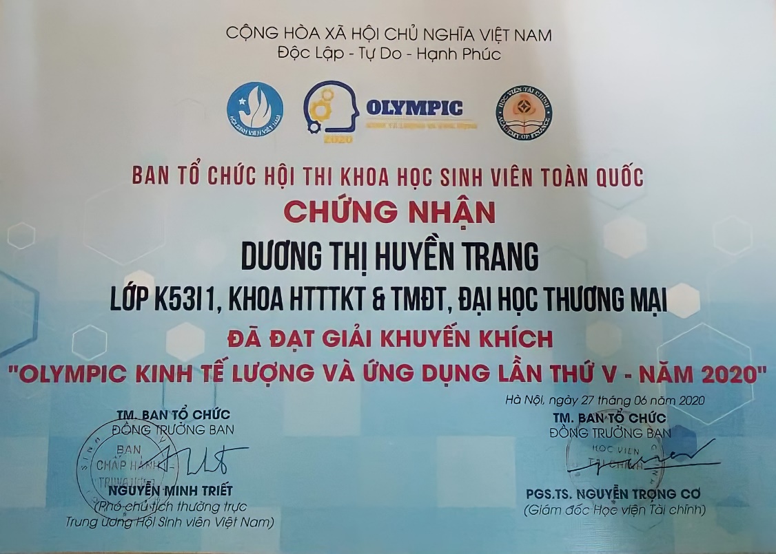 Giấy chứng nhận của SV Dương Thị Huyền Trang đạt giải khuyến khích Olympic Kinh tế lượng và Ứng dụng
