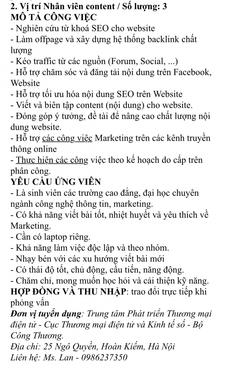 Mô tả công việc: Nghiên cứu từ khoá SEO cho website, kéo traffic từ các nguồn, viết và biên tập content cho website....